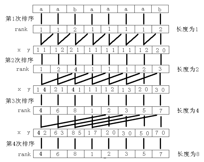 - 以此类推进行倍增,直到排出长度为 \(n\) 的字串的排序,得到的 \(sa\) 和 \(rk\) 即为最终结果。