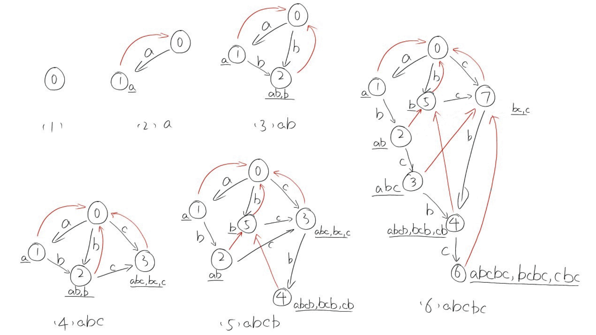 • 如果不存在这样的转移,我们需要缩短当前匹配的部分,这意味着我们需要按照后缀链接进行转移: